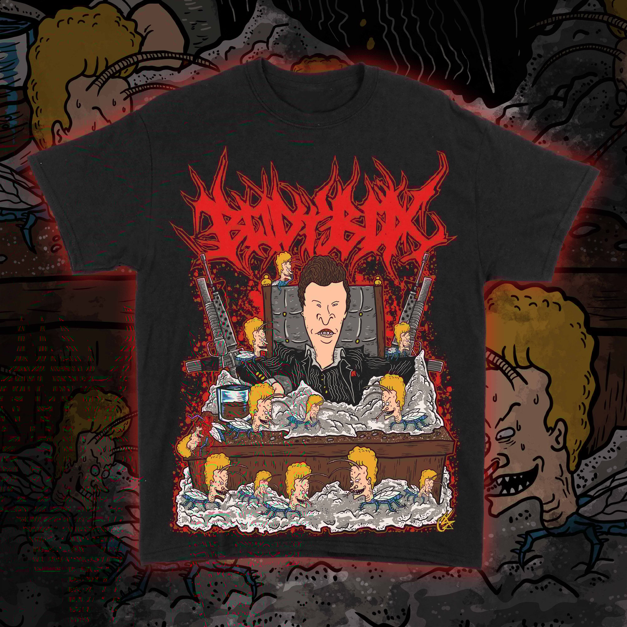 A body box and curly designs Collab T-shirt printed on Gilden heavy